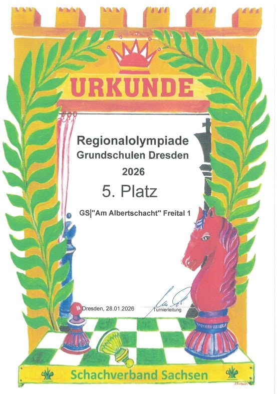 Am 28.01.2026 nahm unsere Grundschule erfolgreich an der diesjährigen Schulschacholympiade teil. In einem starken Teilnehmerfeld von 44 Mannschaften belegte unser Team einen hervorragenden 5. Platz und verpasste damit nur knapp den Einzug in das Landesfinale (Plätze 1–4).